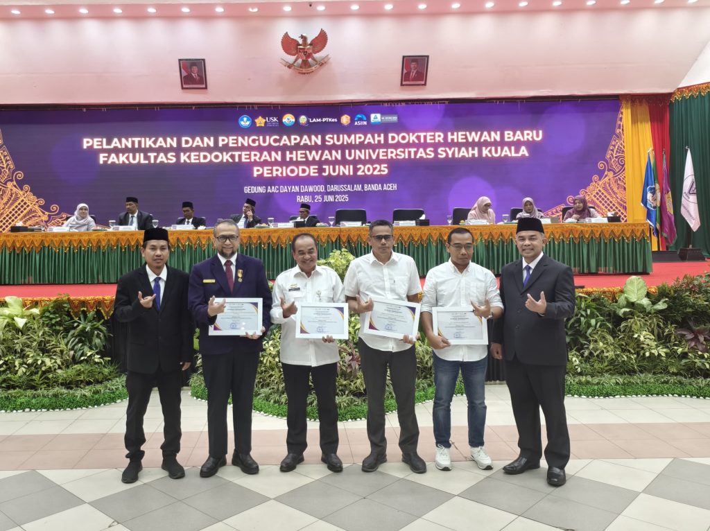 The Faculty of Veterinary Medicine at Universitas Syiah Kuala (FKH USK) once again held its veterinarian inauguration and oath-taking ceremony for the June 2025 period on June 25, 2025. The event, held at the Dayan Dawood Academic Activity Center, celebrated the inauguration of 105 new veterinarians who passed the national competency examination. According to the report by the Coordinator of the Veterinary Professional Education Program at FKH USK, Drh. Budianto Panjaitan, M.Si., 53 of them graduated with the distinction of cum laude (with honors).
